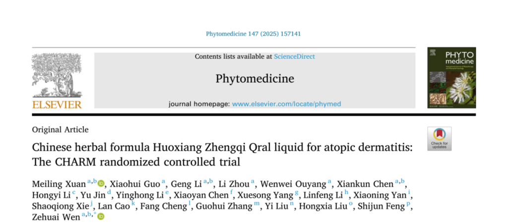近日,太极藿香正气口服液治疗特应性皮炎(AD)的多中心、随机、双盲、对照临床研究(CHARM)取得重大突破,论文发表于国际权威期刊《Phytomedicine》(IF: 6.7)。